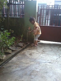 kakak jibril sudah mulai iseng main kran air, paling seneng main air tuh..., trus main kapal dari daun-daun di parit kecil dihalaman..ck..ck..ck..kalo dilarang main air kakak jibril ngambeg.. nangis.